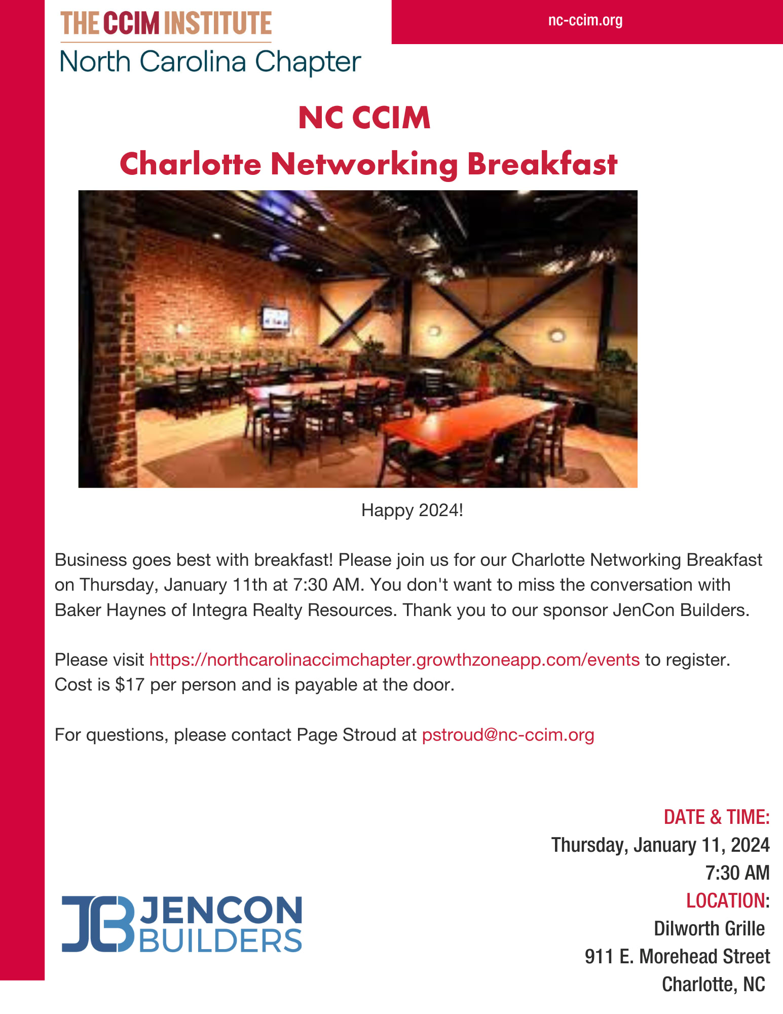 Happy 2024! Breakfast goes best with business! Join us as we enjoy a networking breakfast sure to get your day off to a great start! Come hear the conversation from Baker Haynes of Integra Realty Resources. Thank you to our sponsor JenCon Builders.