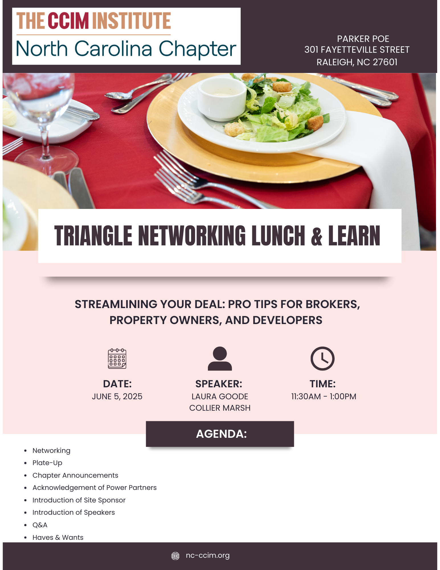 Streamlining Your Deal: Pro Tips for Brokers, Property Owners, and Developers Join us for an insightful Lunch & Learn session where industry experts will share proven strategies to streamline your deals. Whether you're a broker, property owner, or developer, this session will provide valuable pro tips to enhance your negotiation tactics, optimize processes, and close deals more efficiently. Don’t miss the opportunity to learn practical techniques that can save time, reduce complexity, and boost your bottom line—while enjoying a delicious lunch! Cost is $20.